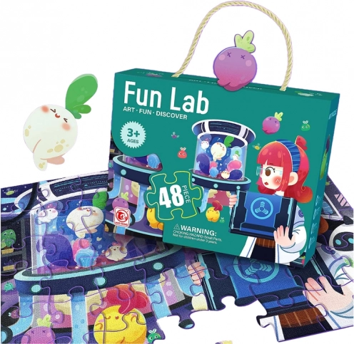 Zabavni otroški puzzle z motivom laboratorija z živalmi iz 48 kosov razvijajo domišljijo, potrpežljivost in fino motoriko. Deli so veliki (pribl. 9 x 7 cm) in jih je enostavno sestavljati; končna slika meri 50 x 34 cm. Kakovostna izdelava za večkratno uporabo, primerno od 3 let, skladno s EN 71.