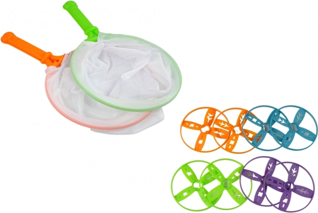 Družinska spretnostna igra Ujemi frisbee: katapult, 8 diskov, 2 mrežici in zaščitna očala. Razvija reflekse in koordinacijo. Zabava doma in na prostem.