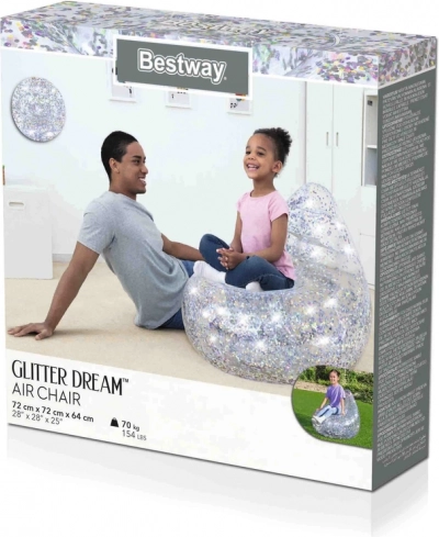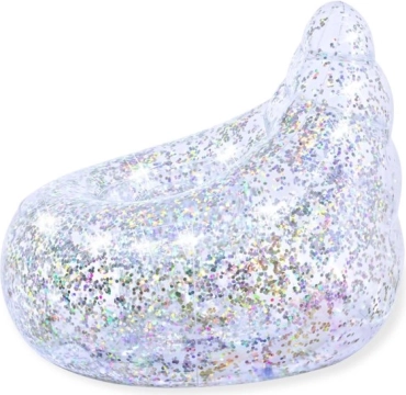 Napihljiv stol se ponaša s prozorno plastiko, polno barvnih bleščic, ki se bleščijo z vsakim gibom in dodajajo vašemu prostoru pridih elegance.