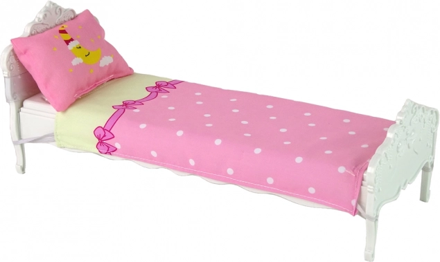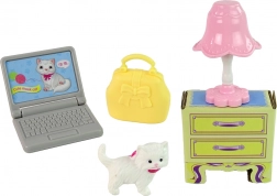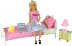 Del kompleta so udobna postelja z posteljnino, nočna omarica z lučko in sodoben prenosnik, ki prizorom dodajo realističnost. Dolge lase punčke je mogoče česati, plesti in krasiti s pomočjo ogledalca in glavnika. Ne manjkata niti mucka in modna torbica za še več možnosti igre.