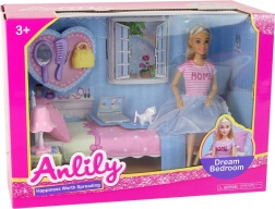 Ta oblikovalski komplet za spalnico spremeni igro v vsakodnevno pravljico. Punčka ANLILY v rožnatem topu in modrem krilu bo postala najboljša prijateljica, medtem ko elegantno pohištvo in dodatki ustvarijo prijetno okolje za počitek in zgodbe, polne ustvarjalnosti.