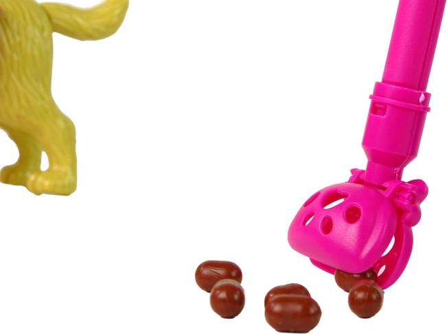 V kompletu so rožnat povodec, koš in zbiralna lopatka – otroci vadijo odgovornost, hranjenje in pospravljanje za ljubljenčkom skozi zabavno igro.
