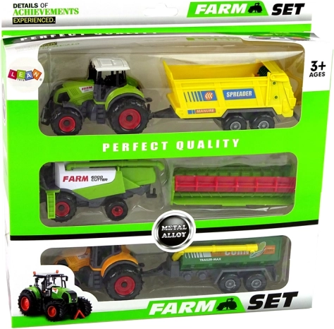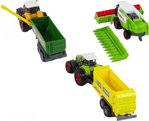 Komplet ponuja vse za malega kmeta: dva traktorja z različnima prikolicama in funkcionalni kombajn. Vsak del je zasnovan tako, da zvesto posnema prave kmetijske stroje – od oblike do barvne obdelave. Enostavno manevriranje in kompatibilni vlečni elementi omogočajo hitro menjavanje sestav in ustvarjanje novih igralnih scenarijev.
