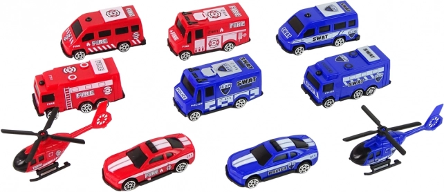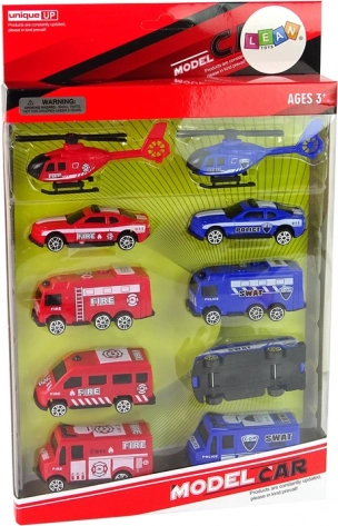 Set 10 reševalnih vozilc policije in gasilcev za otroke 3+. Realistični detajli, kompaktne mere, certifikata CE in EN71. Odlično darilo za male junake.