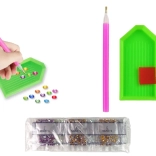 Set vsebuje raznobarvne kristalčke, ki jih lahko uporabite za okrasitev. Površina za lepljenje diamantov je premazana z lepilom, številke pa označujejo, katero barvo uporabiti. Polagajte enega za drugim in ustvarite majhno umetnino!