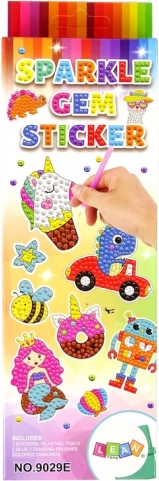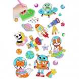 Komplet vsebuje vse potrebno za izdelavo bleščečih nalepk, ki bodo razveselile vsakega ljubitelja ustvarjanja. Ta ustvarjalna dejavnost spodbuja potrpežljivost, natančnost in ročne spretnosti. Vsaka nalepka ima površino s plastjo lepila in označbe za barve diamantkov, ki jih je treba pritrditi. Ustvarite si majhno umetnino z lepljenjem kamenčka za kamenčkom! Nalepke prikazujejo vesoljske rakete, leteče krožnike, astronavte v podobah živali in majhne planete.