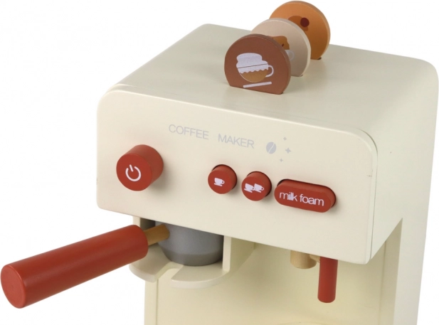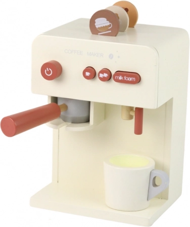 Ta leseni kavni aparat verno posnema pravi stroj, zato se otroci lahko počutijo kot pravi baristi. Upravljanje vključuje »gumb« za vklop, izbiro enega ali dveh napitkov in funkcijo penjenja mleka, kar spodbuja domišljijo in posnemanje vsakdanjih opravil.