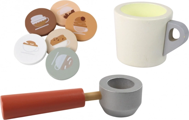 Kakovostna kombinacija lesa in plastike je trpežna in prijetna na dotik. Igra s kavnim aparatom razvija fino motoriko, koordinacijo oko–roka ter socialne veščine pri skupni igri. Zaradi kompaktnih dimenzij je aparat enostavno prenašati in pospraviti.