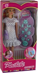Lutka se ponaša z elegantnim videzom v belih oblekah s črnimi pikami, rožnatimi čevlji in modo dopolnjuje mala torbica.