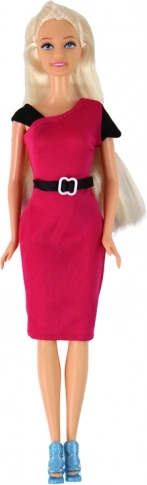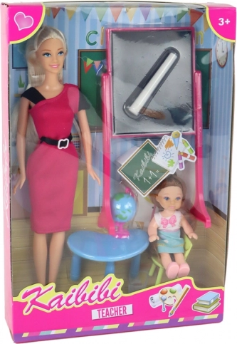 Lutka učiteljice z dolgimi blond lasmi in roza elegantno obleko s črnim pasom.