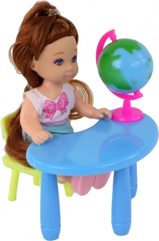 Odkrijte odličen komplet igrač, ki vključuje učiteljico in učenko, oblečene v elegantna in stilska oblačila. Set dopolnjuje tabla s kredo, mizica in stolček, ki so idealni za ustvarjanje šolskega okolja. Globus omogoča odlične možnosti za igro učenja in spoznavanja sveta.