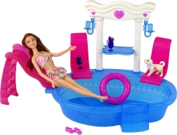 Predstavljamo lutko z interaktivnim igralnim setom, ki vključuje vse potrebno za pustolovščine pri bazenu. Čudovit moder bazen velikosti 26 cm x 34 cm x 23,5 cm je idealen za napolniti z vodo in ustvariti prostor za vodne pravljice. Na voljo sta tudi dva roza ležalnika, kjer bosta lutka in njen pasji prijatelj našla udobje.