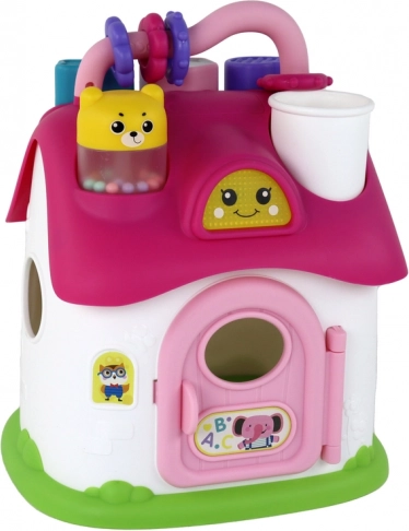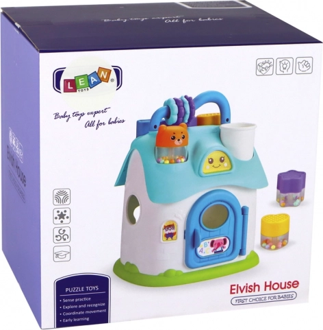 Hišica ima štiri različne odprtine na strehi za razvrščanje po obliki in barvi ter barvna vrata, ki se odpirajo. Na strehi je okno z nasmejanim obrazom, ki sveti in oddaja zvoke, kar spodbuja interakcijo in pritegne otrokovo pozornost.