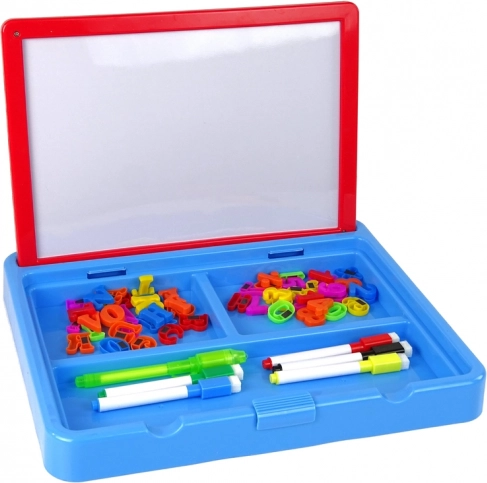 Del kompleta je praktičen shranjevalni zabojček s 3 predelki za flomastre, magnetne črke in številke. Tabla je odličen izobraževalni pripomoček za predšolske otroke: razvija ustvarjalnost, koncentracijo in motoriko, magneti pa pomagajo pri spoznavanju abecede in matematike.