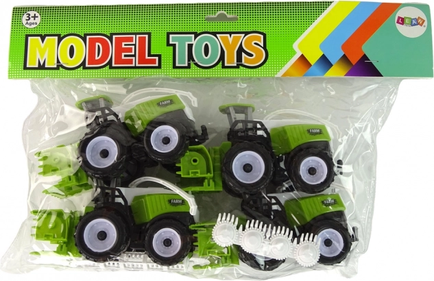 Set vključuje štiri traktorje in dodatke, kar omogoča različne igre in zgodbe za male kmete.