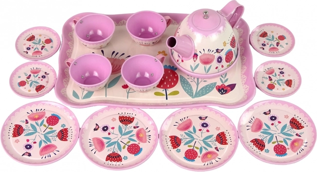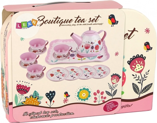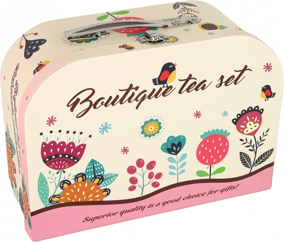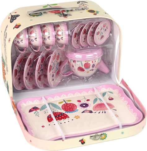 Prisrčen otroški čajni in kavni set v prenosnem kovčku bo razveselil male bariste in gostiteljice. Vsebuje do 15 delov z rožnatimi vzorci – skodelice, krožničke, čajnik s pladnjem in kovček za enostavno prenašanje. Podpira igro vlog in domišljijo, je idealen za otroke od 3 let in izpolnjuje standarde CE / EN 71.