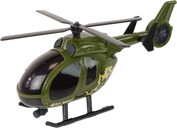 Realistično oblikovan helikopter s kamuflažo in rotorjem, ki ga je mogoče ročno zavrteti – idealno za dinamične zračne prizore.