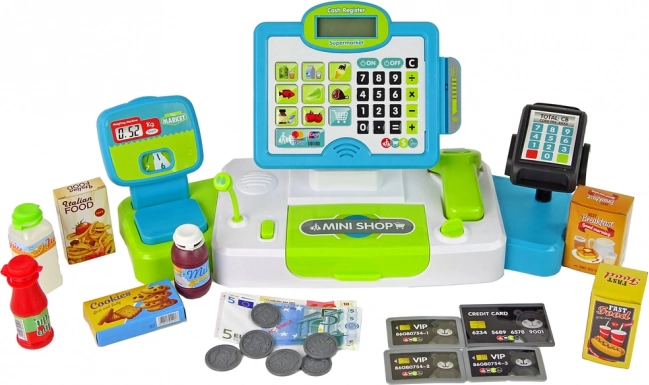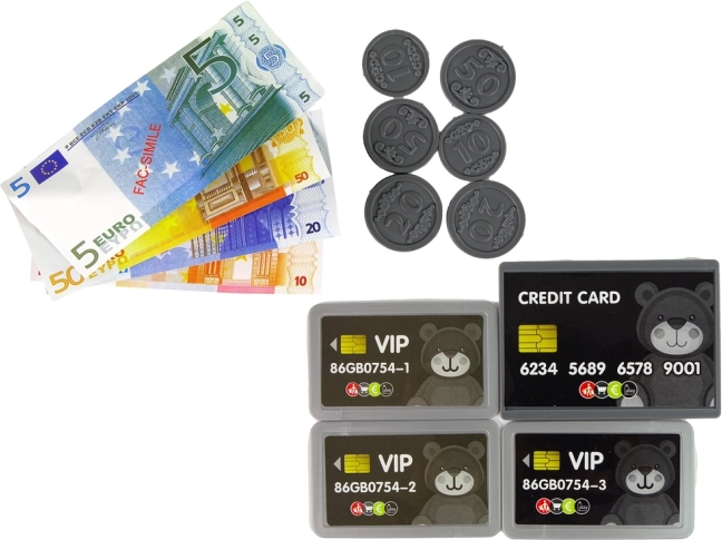 Del kompleta so tudi denar, kartice in različni izdelki, ki otrokom omogočajo simulacijo nakupovanja in razvoj matematičnih veščin.