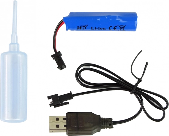 V paketu najdete polnilno Li‑ion baterijo, USB kabel za udobno polnjenje in plastenko za vodo za parni učinek. Vse pripravljeno za hiter začetek.