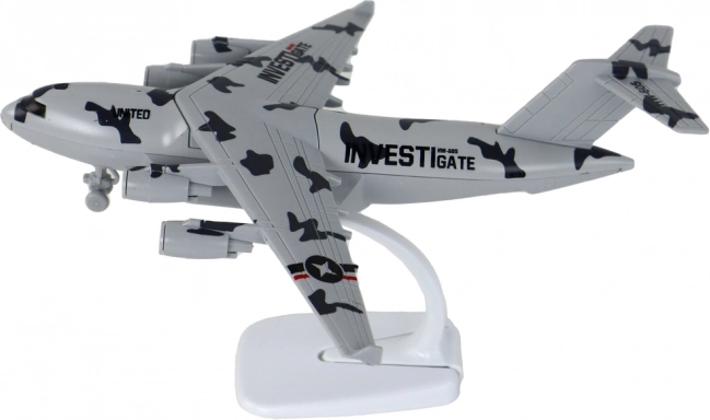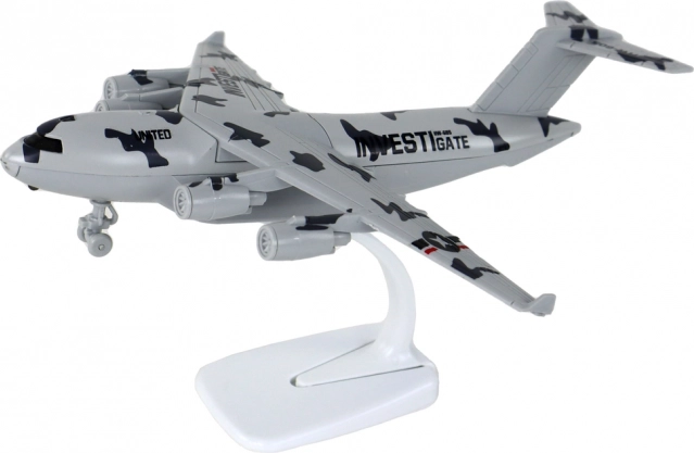 Sivo vojaško letalo s kamuflažnim dizajnom deluje verodostojno in efektno tako na polici kot pri igri. Zahvaljujoč štirim motorjem, napisu UNITED in kakovostni izdelavi iz kovine in plastike dobite vzdržljiv model, ki odlično izgleda in hkrati zabava.