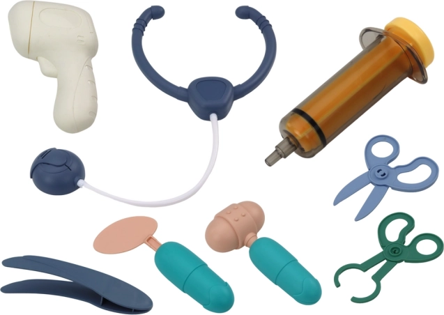 Komplet vsebuje vse potrebno za osnovno „ambulanto“: brizgo, škarje, stetoskop in druge dodatke. Izdelan je z mislijo na varnost ter ustreza standardom CE in EN71, zato je primeren za otroke od 3 let dalje.