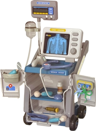 Ta moder zdravniški komplet otrokom omogoča, da se vživijo v vlogo pravega zdravnika. Delujoč stetoskop z zvoki daje igri pristnost, medtem ko prenosni voziček ohranja vse pripomočke na enem mestu in olajša premikanje po sobi. Z dekorativnimi nalepkami lahko otroci svoj komplet personalizirajo.