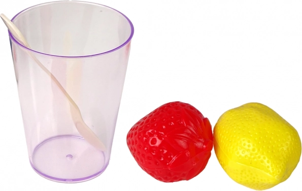 V kompletu so skodelice, krožnički, kozarček, žlička in prikupno sadje – jagoda in limona – za stilsko postrežbo.