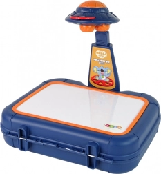 Ta interaktivni projektor za risanje v priročnem modrem kovčku omogoča otrokom projiciranje slik s tematskih kolutkov (živali, oblačila, žoge, sadje, zelenjava, prevozna sredstva) na belo površino in njihovo preprosto prerisovanje. Nastavljivo stojalo pomaga prilagoditi višino projekcije, da je risanje vedno udobno in jasno.