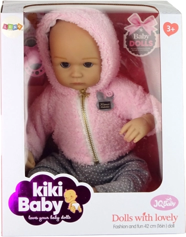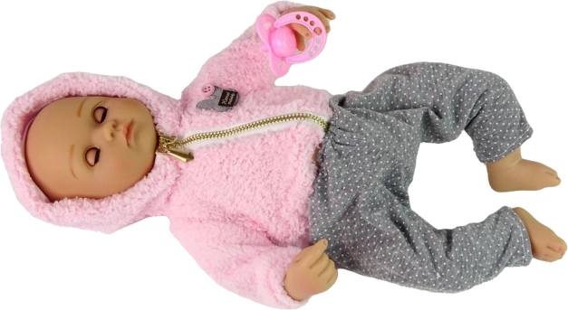 Odkrijte čar igre skrbi z realistično punčko dojenčka, ki očara s prijaznim izrazom in detajli. Obleka vključuje mehko rožnato jopico in sive hlače s pikami, ki jih je lahko kombinirati z drugimi kosi. Punčka ima členjene okončine, zato jo lahko otroci zlahka posedajo, polagajo in ustvarjajo različne prizore.
