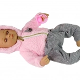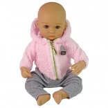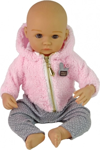 Mehka rožnata jopica in sive hlače s pikami dajo punčki pristen in prikupen videz, ki ga bodo otroci hitro vzljubili.