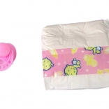 V paketu sta dudek in plenička, s katerima lahko otroci previjajo in pomirjajo dojenčka kot pravi mali skrbniki.