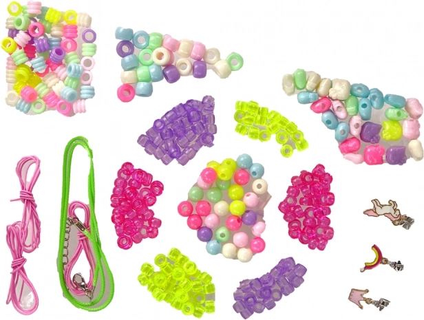 - Tri rožnate nitke, zelen pašček in trije obeski: omogočajo ustvarjanje osebnih zapestnic in ogrlic.
