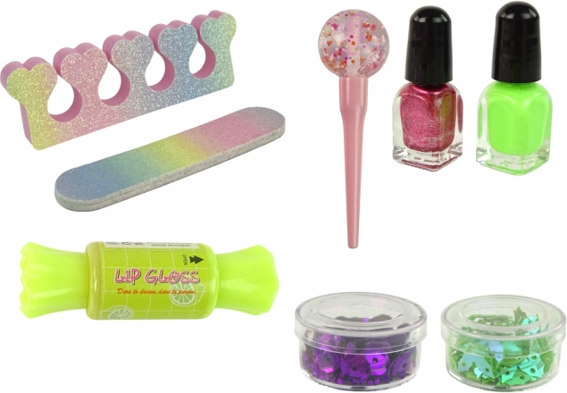 Ta čudovit kozmetični set vsebuje številne privlačne elemente, ki bodo razveselili vsako mlado navdušenko nad stilom. Kozmetični separator pomaga pri lakiranju nohtov, medtem ko dva glosa za ustnice dodata čar in sijaj. Pilica in trije laki za nohte, od tega dva z bleščicami in eden v živahni barvi, omogočajo kreativno okraševanje nohtov z različnimi vzorci.