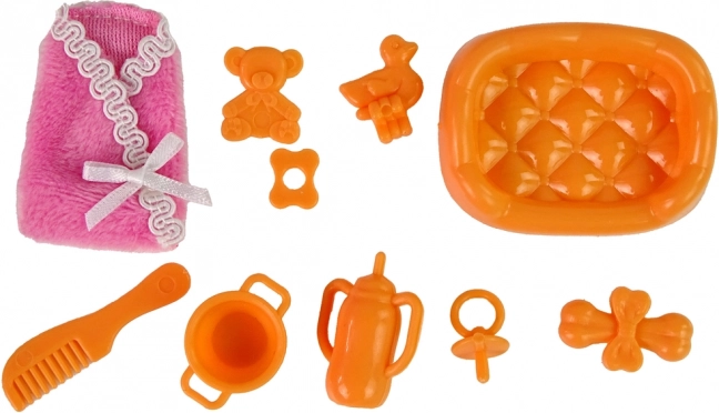 Set vključuje različne dodatke, kot so glavniček, račkica za kopanje in otroška steklenička, ki povečajo možnosti igre.
