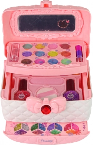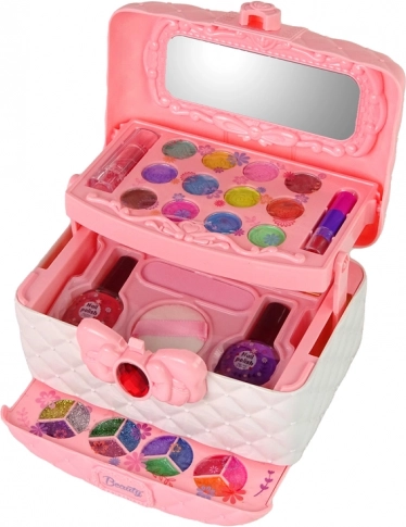 Ta eleganten kovček s pentljo skriva vse potrebno za varno otroško ličenje in ustvarjalno igro salona lepote. Zahvaljujoč trem preglednim predalčkom imajo otroci vse dodatke lepo pri roki, ogledalce v pokrovu pa pomaga pri končnem videzu. Kompaktne mere 16 × 18 × 10 cm omogočajo enostavno prenašanje na obiske in počitnice.