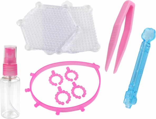 Komplet vsebuje podlage, razpršilec, pinceto in orodje za prijemanje perlic, tako da lahko otroci začnejo ustvarjati takoj po odprtju.