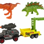 Ta dinozavrski komplet popelje otroke v svet davnih časov. V njem najdete TIRANOZAVRA v rjavo-oranžnih odtenkih in STEGOSAVRA v zeleni barvi z izrazito oranžno grivo na hrbtu. Terensko vozilo je opremljeno z raketometom s premičnim izstrelkom in prikolico s kovinskimi rešetkami za varen prevoz “prazgodovinskih” ujetih bitij.