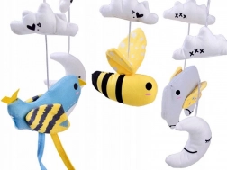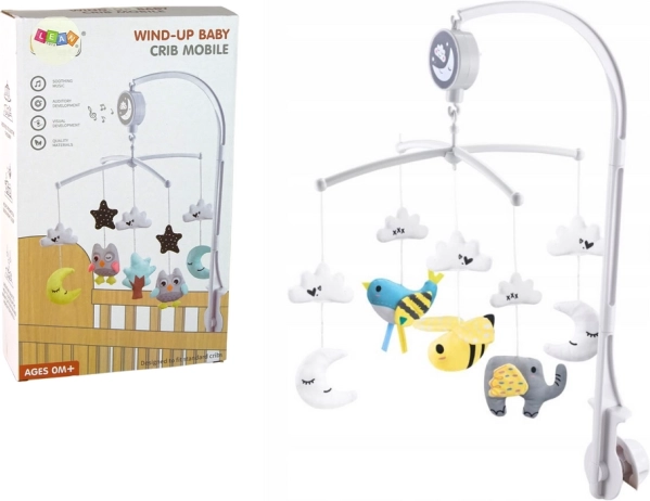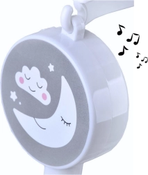 Navijalni vrtiljak za otroško posteljico je opremljen z veselimi oblaki, mesecem in pisanimi živalicami, ki bodo zagotovo pritegnile vašo otroka. Po navijanju se vrtiljak vrti za 360° in neprestano predvaja melodijo. S stikalom ON/OFF lahko kadar koli prekinete melodijo.