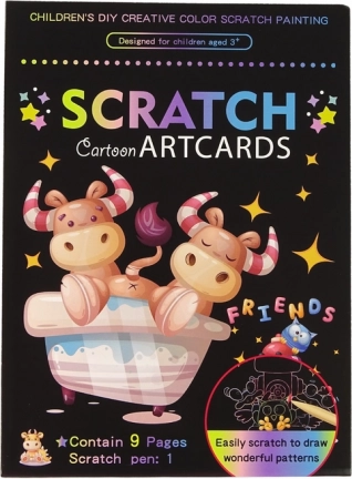 Ta ustvarjalni komplet otrokom prinaša veselje do igre in učenja. Dovolj je vzeti leseni pisalo-praskalnik, nežno postrgati črno plast in pod njo se pokažejo lepe, barvite scene z živalicami. Velikost kartic odlično ustreza otroški roki, kar olajša držanje in uporabo.
