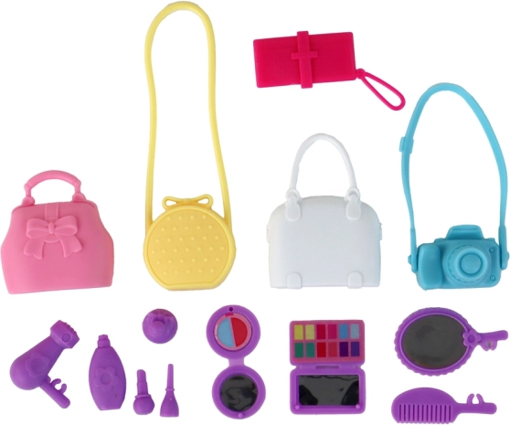 - Punčka v obleki, dodatki za ličenje in pričeske, 5 torbic