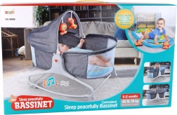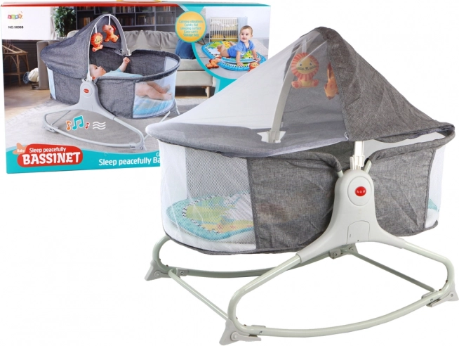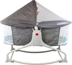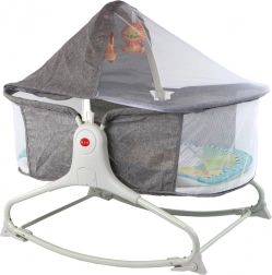 Ta večfunkcijska rešitev združuje posteljico, podlogo in gugalnico v enem. Opremljena je z montažno mrežo in senčnikom, ki ščiti otroka pred insekti in soncem, kar omogoča miren spanec na svežem zraku. Siva barva ustvarja prijetno in spodbudno okolje. Če je potrebno, lahko gugalnico pretvorite v stabilno posteljico z razširitvijo nog.