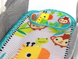 Gugalnico lahko uporabite tudi kot udobno igralno podlogo na tleh. Del kompleta je odstranljiv lok z ljubkimi igračkami, kot sta lev in žirafa, izdelanimi iz kakovostnega materiala, kar spodbuja otrokove čute. Vesela živalska tematika na materialu gugalnice ponuja otroku zabavo.