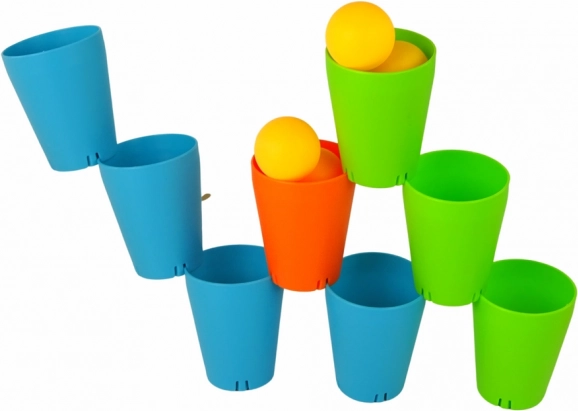 Zlaganje lončkov in metanje rumenih žogic podpira pri otrocih razvoj ročne spretnosti in koordinacije oči in rok.
