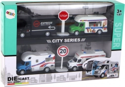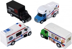 .Komplet vsebuje črn tovornjak, sladoledarski voz na kolesih, bivalno vozilo pripravljeno na izlet ter reševalno vozilo za uprizarjanje dramatičnih reševalnih akcij. Vsako vozilo je natančno reproducirano v merilu 1:87, kar mu daje realističen videz in edinstven čar.