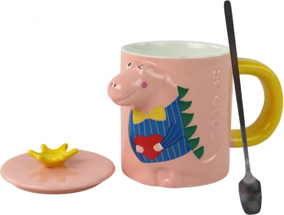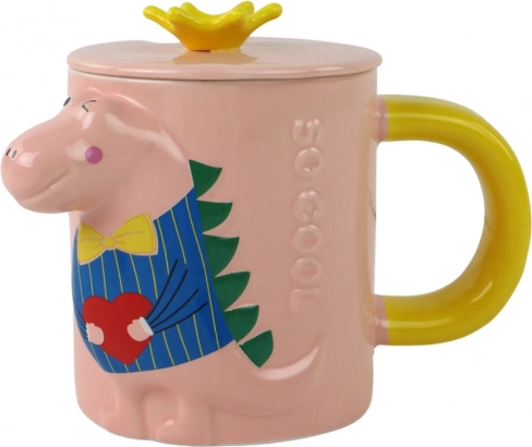 Ta stilska keramična skodelica združuje funkcionalnost in igriv dizajn. Rožnato ohišje z rumenim ročajem dopolnjuje pokrov z rumeno krono, ki ščiti napitek in poudari izviren videz. Reliefni 3D motiv dinozavra bo vsak požirek napolnil z veseljem – idealno za kavo, čaj in kakav.