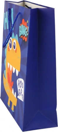 Stilna papirnata darilna vrečka v temno modri barvi z ljubkim motivom dinozavra in nežnim bleščanjem bo vašemu darilu dodala izjemen videz. Trdni pleteni vrvici ročajev zagotavljata udobno prenašanje, zato je idealna za rojstne dni, praznike in druge otroške zabave.