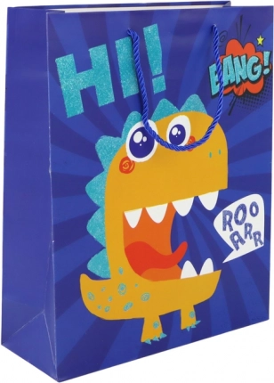 Ta darilna vrečka z igrivim dino motivom vsakemu darilu doda zabaven in izviren videz. Univerzalna temno modra podlaga deluje elegantno, izrazita grafika pa še posebej pritegne otroke. Vrečka je primerna za različne priložnosti – od rojstnih dni do otroških zabav.