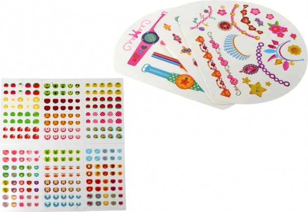 Po odstranitvi plastičnega vložka se razkrije set začasnih tetovaž v obliki ur, ogrlic, uhanov in prstanov – idealno za igrivo eksperimentiranje z dodatki brez zavez. Kovček spodbuja kreativno igro, razvoj fine motorike in okus otrok.