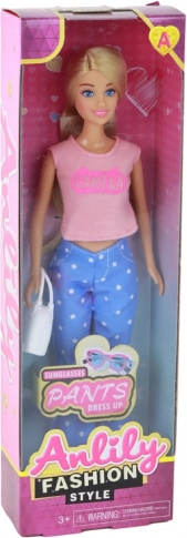 Stilna punčka ANLILY z dolgimi blond lasmi prihaja v rožnatem topu, modrih hlačah z zvezdicami in rožnatih supergah. Priloženi so bela torbica in modra očala za ustvarjalno oblikovanje. Velikost punčke 30 × 7 × 5 cm, embalaža 32 × 11 × 5 cm. Certifikat CE, standard EN71, primerno od 3 let.