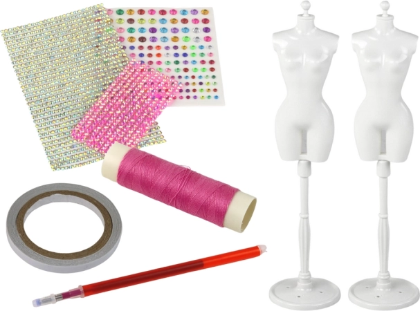 - 5 različnih tkanin za obleke; 2 stojali za obleke; pisane in srebrne bleščice; trak; nit; vzorčnik; šablona z merami; navodila